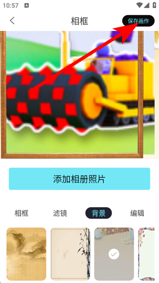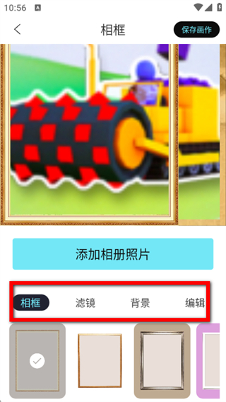 3、在照片編輯界面,可選擇相框、濾鏡、背景、編輯等選項(xiàng)進(jìn)行設(shè)置。