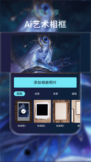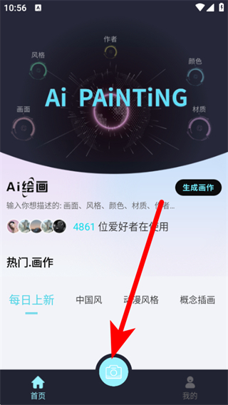 1、在AI繪畫APP首頁(yè),點(diǎn)擊底部相機(jī)圖標(biāo),進(jìn)入相框頁(yè)面。