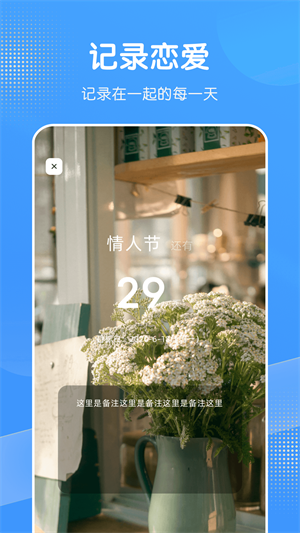 - 加入紀(jì)念日記錄助手,設(shè)置日期開啟倒數(shù)日紀(jì)念,還有情人節(jié)等節(jié)假日的提醒。