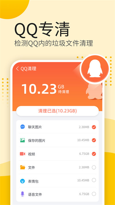 -軟件專(zhuān)清,對(duì)微信、QQ等軟件有專(zhuān)門(mén)的清理板塊,這些軟件里有各種圖片、視頻、語(yǔ)音垃圾,可以一鍵清理。