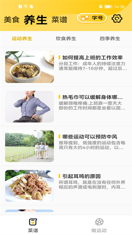 喜閱大字版app一款集菜譜、美食、運(yùn)動(dòng)等功能于一身的平臺(tái),大家可以在這里了解到很多的美食、健康方面的各種知識(shí),大字版設(shè)計(jì)更加方便用戶閱讀。