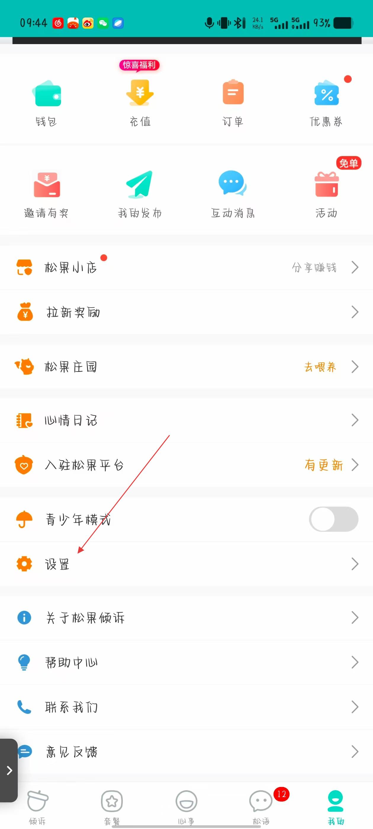1、打開松果傾訴APP,進入個人中心頁面,在個人中心頁面找到并點擊設(shè)置選項。