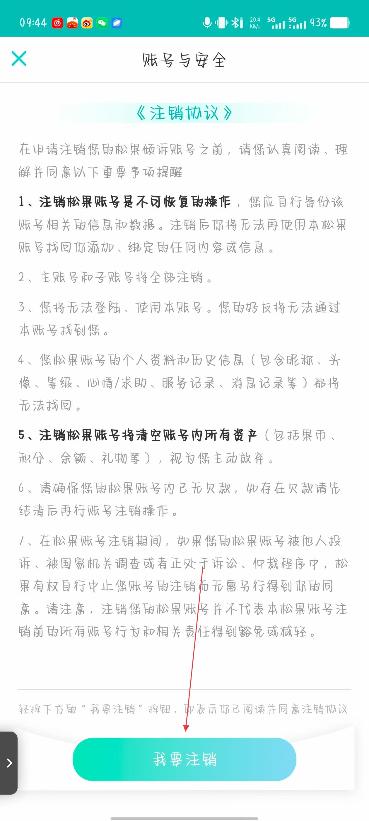 4、點擊頁面底部的我要注銷按鈕,按照后續(xù)提示完成身份驗證等操作,即可提交賬號注銷申請。
