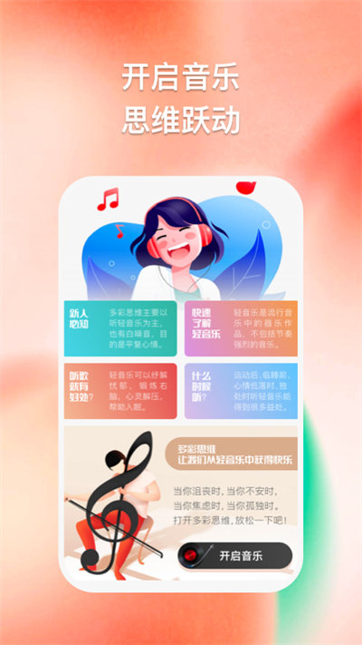 -打開思維,通過音樂的舒緩,鍛煉自己的右腦,讓自己的情緒快速的平靜下來,很好的消除白日的勞累感;