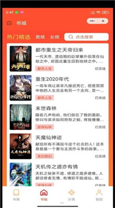 -分類多樣,在軟件中你能看到相對應(yīng)的板塊內(nèi),各種小說的分類很明確,可以根據(jù)喜好篩選,非常方便;
