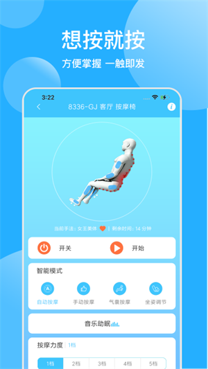 顧家按摩椅讓大家用手機就能控制顧家按摩椅的使用,一鍵點擊開關進行按摩,查看當前按摩的位置,點擊開啟音樂助眠,還有按摩力度可以選擇,每個小伙伴都能在線自由調(diào)整。