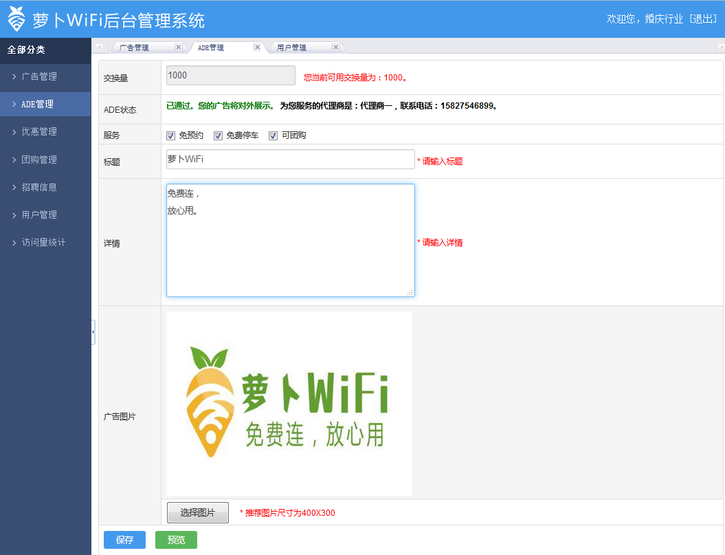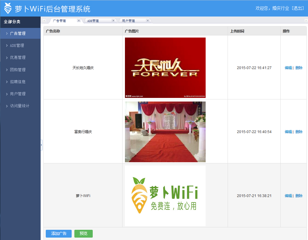 4.廣告編輯:點擊后進入“蘿卜WiFi后臺管理系統(tǒng)”,可以在該后臺進行廣告管理、ADE管理、用戶管理等操作,詳見2.1-后臺管理系統(tǒng)介紹。
