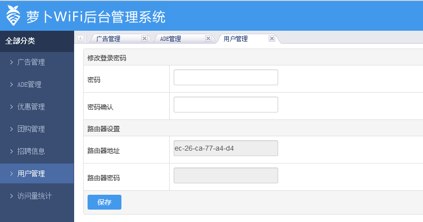 后臺管理系統(tǒng)是商家進行廣告發(fā)布、用戶管理的入口,登錄用戶名及密碼與蘿卜WiFi軟件登錄密碼一致。