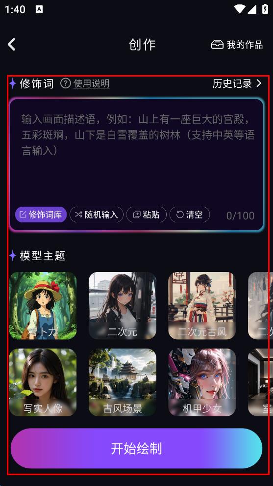 4、登錄后進(jìn)入創(chuàng)作頁(yè)面,在“輸入畫面描述語(yǔ)”欄填寫想要生成的畫面描述,再選擇模型主題,比如“二次元”“古風(fēng)場(chǎng)景”等,之后點(diǎn)擊“開(kāi)始繪制”,即可生成相應(yīng)的繪畫作品。
