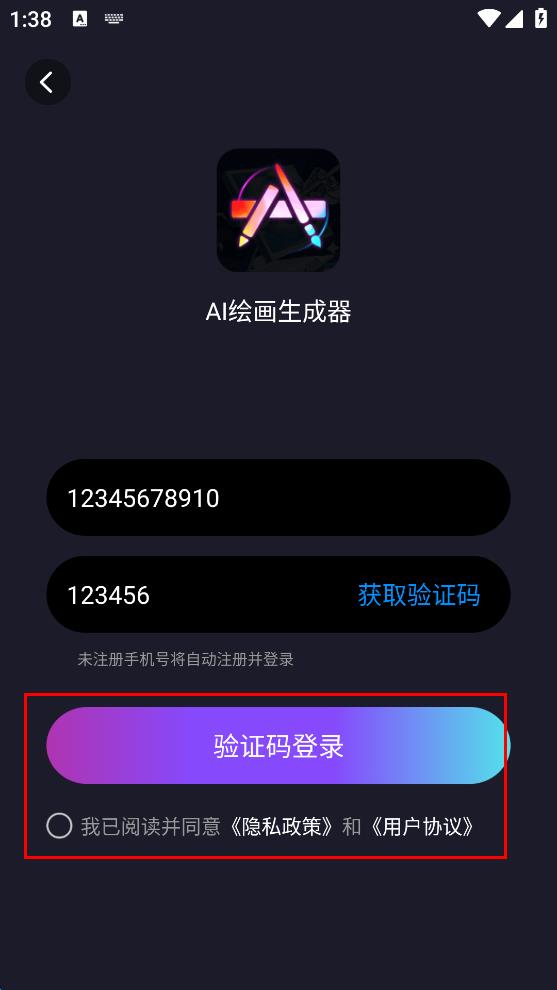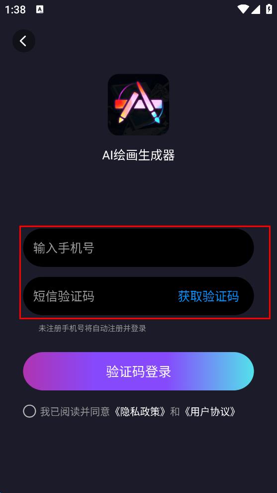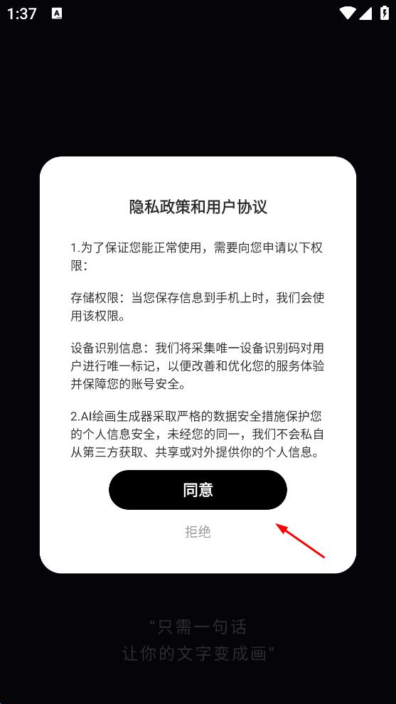1、打開(kāi)AI繪畫生成器軟件,彈出“隱私政策和用戶協(xié)議”提示彈窗,閱讀相關(guān)內(nèi)容后,點(diǎn)擊“同意”,進(jìn)入登錄頁(yè)面。