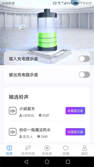2、【鈴聲】一鍵設(shè)置充電時(shí)的好聽(tīng)鈴聲;