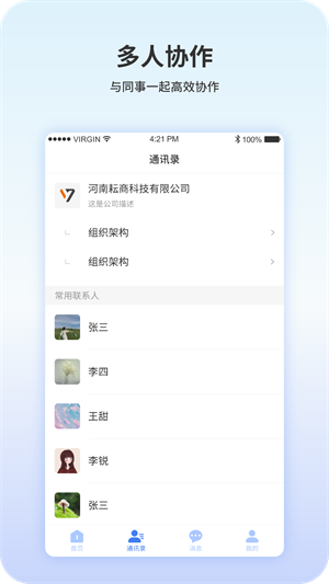 - 提供免費的創(chuàng)業(yè)學習材料和可靠的在線服務(wù),公司里每個人的通訊錄詳細的顯示。