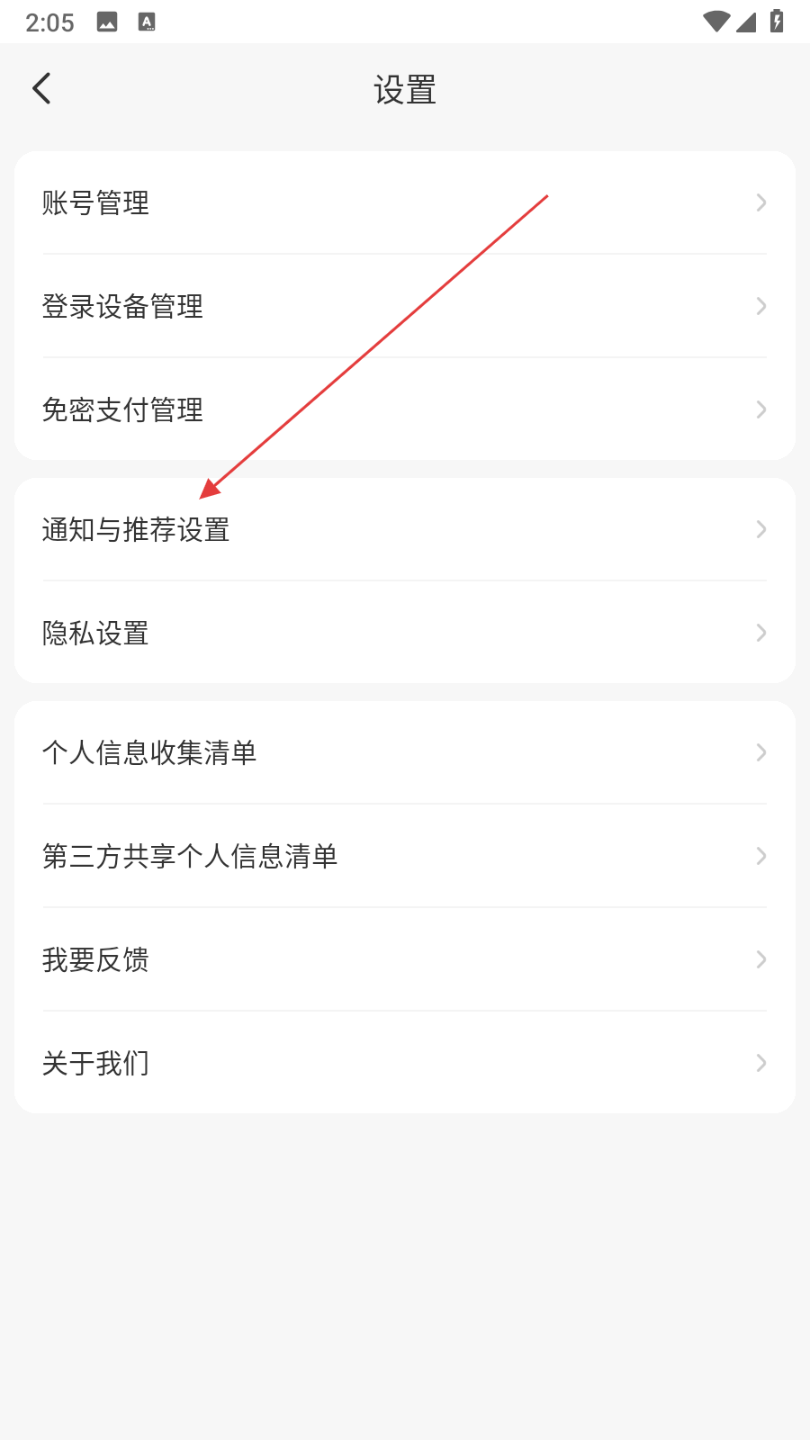 3、在設(shè)置界面里,點(diǎn)擊通知與推薦設(shè)置選項(xiàng),進(jìn)入對(duì)應(yīng)頁(yè)面。