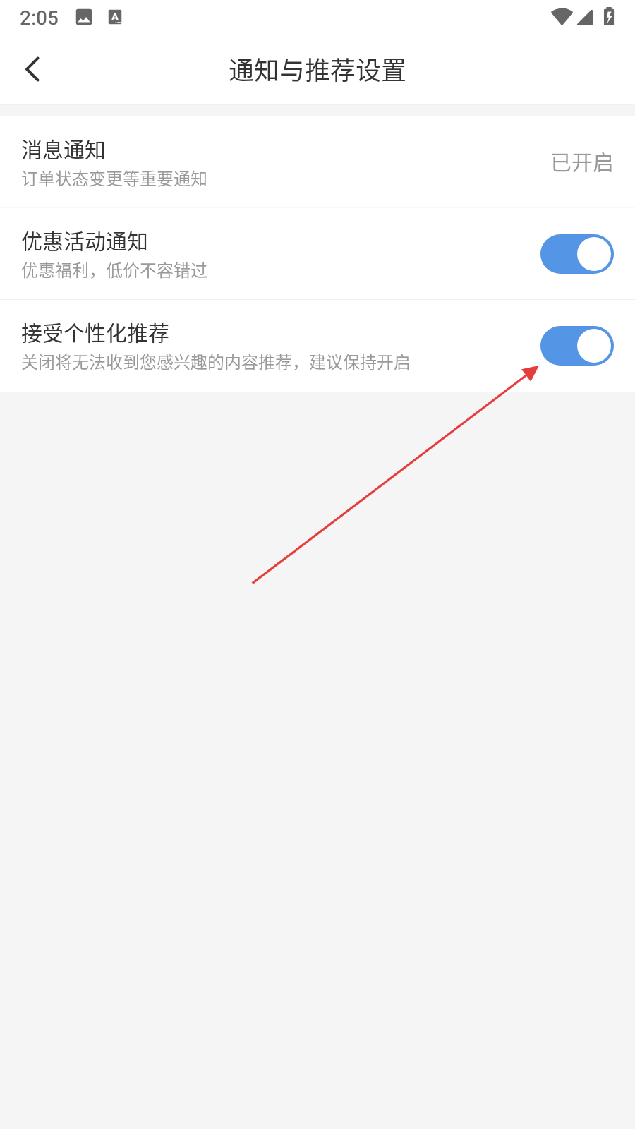 4、在通知與推薦設(shè)置頁(yè)面,找到接受個(gè)性化推薦的開關(guān),點(diǎn)擊該開關(guān)將其關(guān)閉。