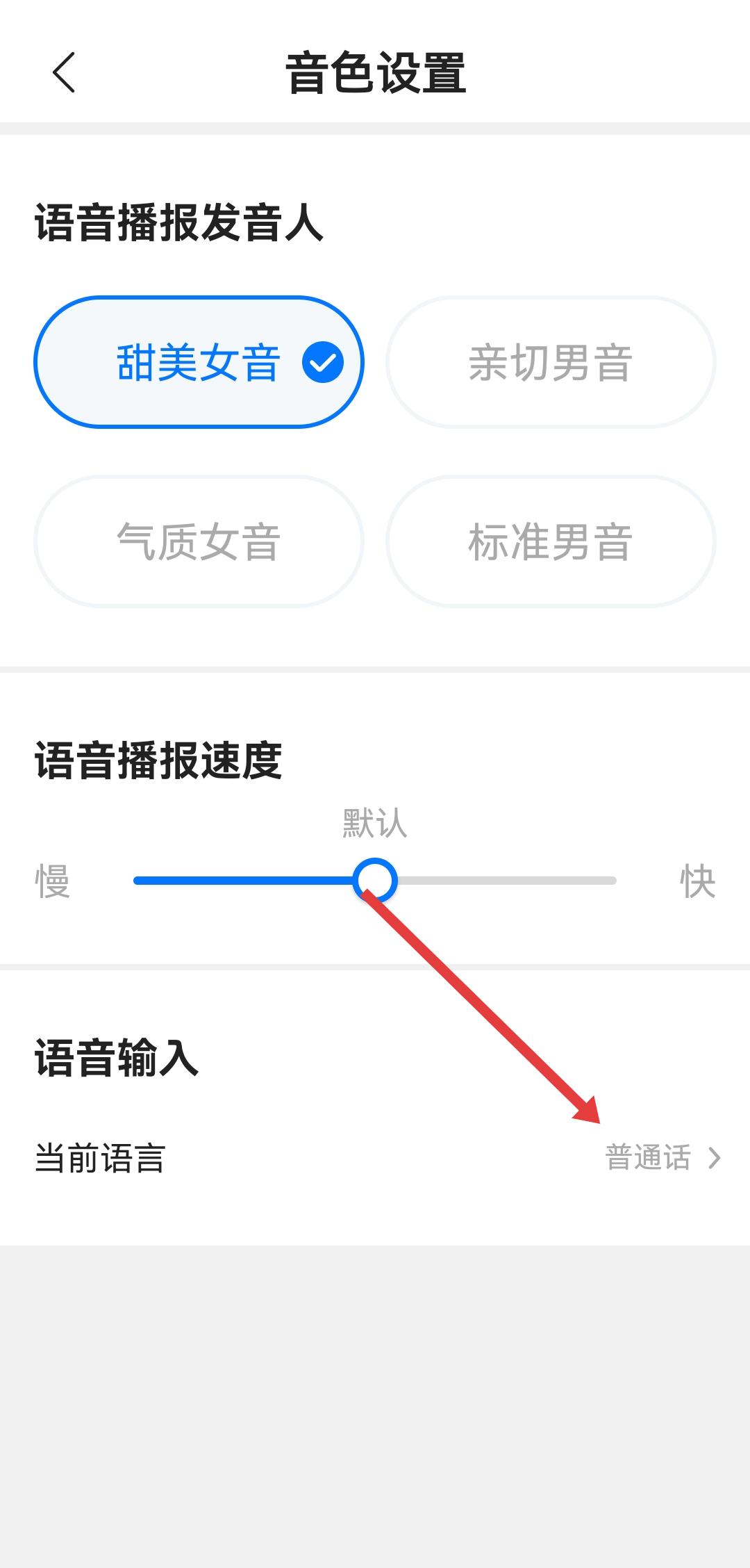 3、在音色設(shè)置頁面,點(diǎn)擊當(dāng)前語言選項(xiàng),進(jìn)入語言選擇的界面。