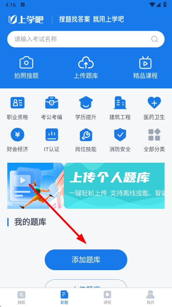 1、打開上學(xué)吧找答案app,在刷題界面中點(diǎn)擊添加題庫(kù),選擇要刷題的考試類型。