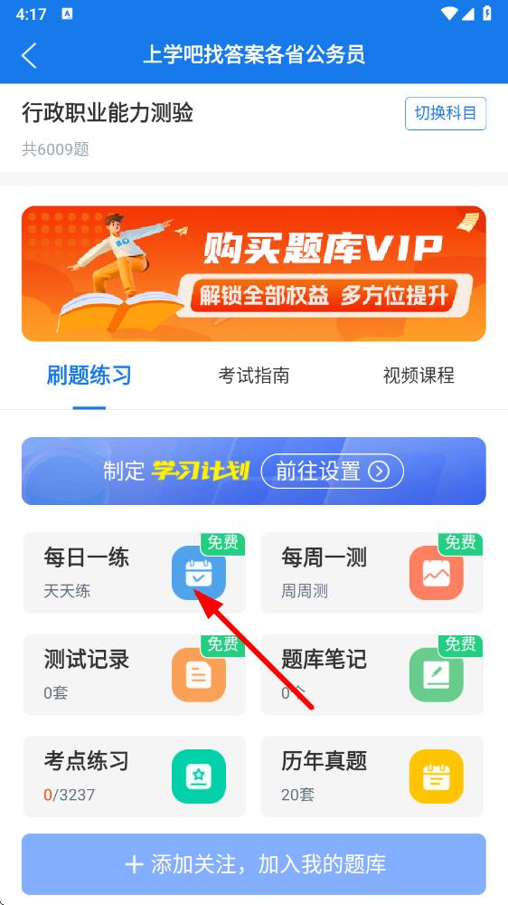 4、選擇科目后,回到刷題界面,點(diǎn)擊每日一練等刷題模塊,進(jìn)入刷題頁面開始做題。