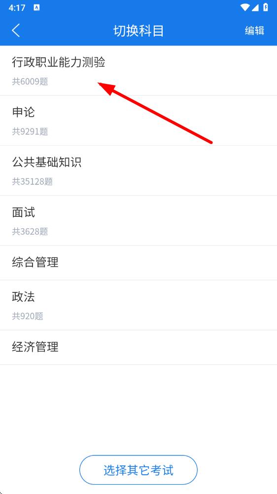 3、進(jìn)入考試題庫(kù)后,選擇想要刷題的具體科目,如行政職業(yè)能力測(cè)驗(yàn)、申論等。