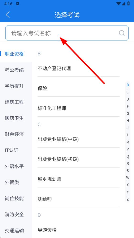 2、在選擇考試頁面,可通過搜索框快速查找考試名稱,找到后點擊進入對應的考試題庫。