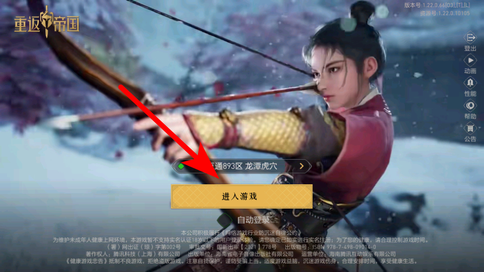 1、打開重返帝國游戲,點(diǎn)擊進(jìn)入游戲按鈕,進(jìn)入游戲界面。