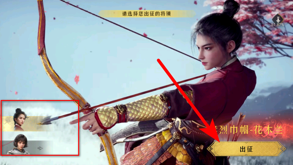 2、在將領(lǐng)選擇頁面,選擇出征將領(lǐng)如花木蘭,點(diǎn)擊出征按鈕,進(jìn)入戰(zhàn)斗場景。