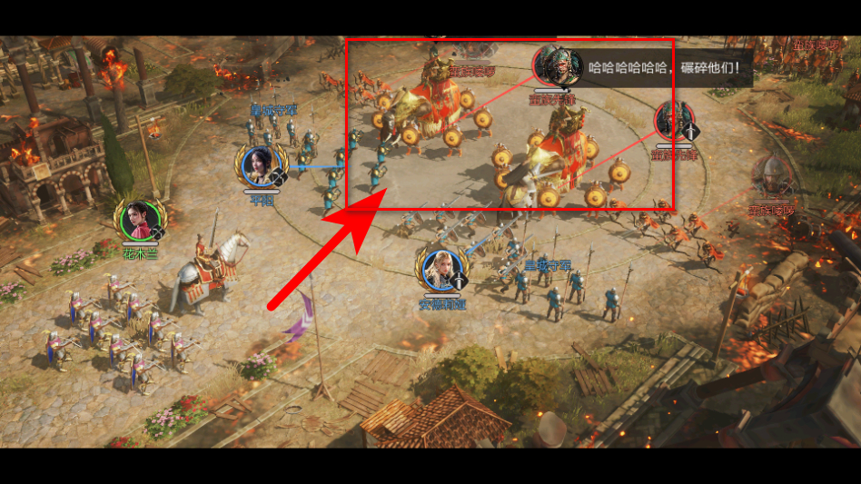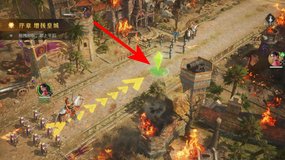 3、在序章增援皇城場景中,拖拽部隊(duì)跟隨黃色箭頭和綠色指引點(diǎn),跟上平陽部隊(duì)。