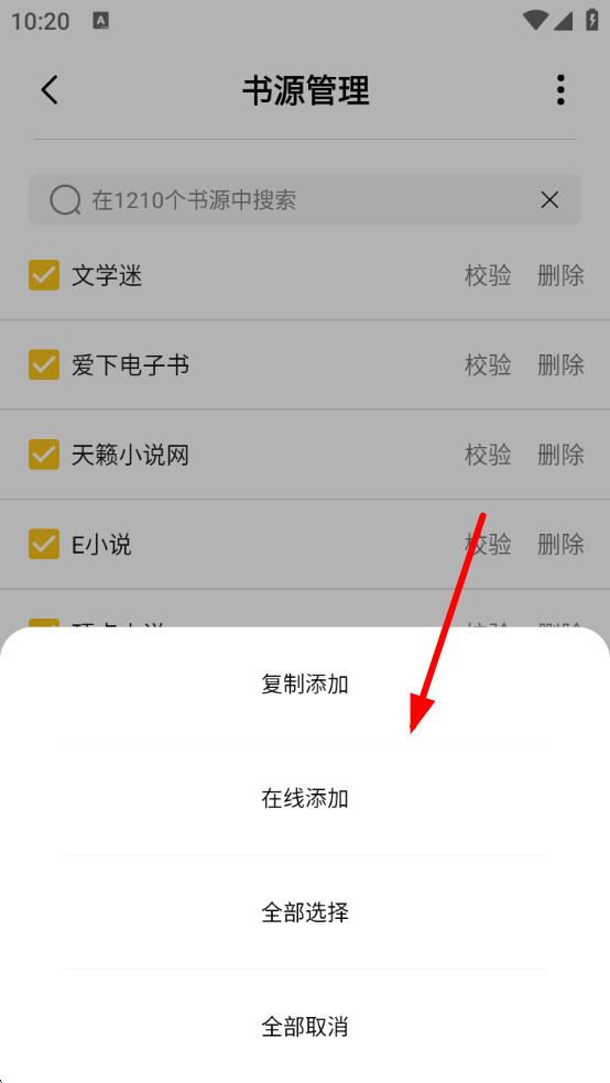 3、在書源管理界面點(diǎn)擊菜單,選擇在線添加來添加書源。