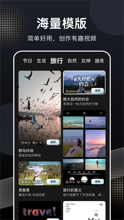 1、該應用如今在針對平時的創(chuàng)作上,帶來了超多的剪輯模板的選擇;