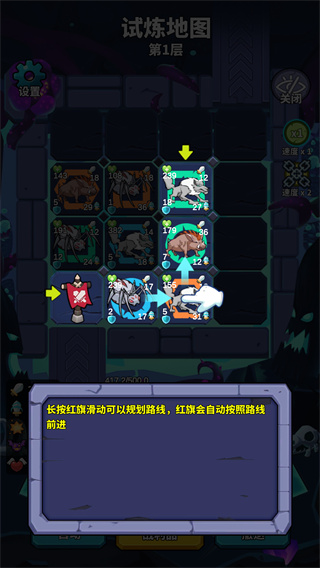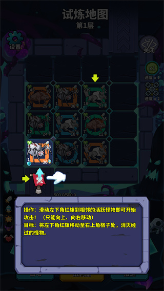 2、操作:滑動左下角紅旗到相鄰的活躍怪物即可開始攻擊?。ㄖ荒芟蛏?、向右移動),將左下角紅旗移動到右上角格子,消滅經(jīng)過的怪物;