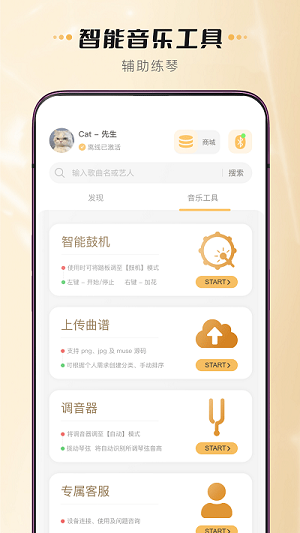4、讓您擁有自己專屬的尤克里里電子樂譜庫,提供樂譜轉(zhuǎn)調(diào)功能,助您輕松找到合適的調(diào)性,提供四行樂譜發(fā)聲功能。