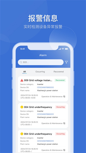 - 你可以簡單的體驗手機實時檢查詳細的監(jiān)控信息,幫助用戶監(jiān)控其光伏設備的狀態(tài)。