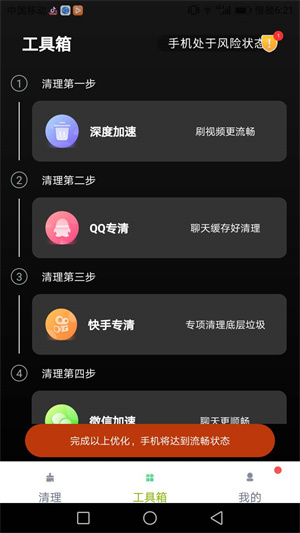 3、解決手機(jī)滯后問題,一鍵提速,讓手機(jī)快速運(yùn)行。