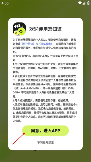 1、打開戀知道軟件,查看彈出的用戶協(xié)議與隱私政策說明,點擊同意進入APP按鈕。