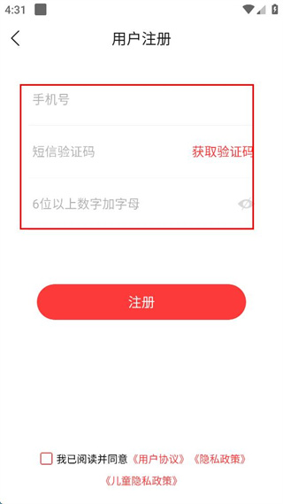 3、在用戶注冊(cè)頁(yè)面輸入手機(jī)號(hào),點(diǎn)擊獲取驗(yàn)證碼,輸入驗(yàn)證碼,設(shè)置密碼。