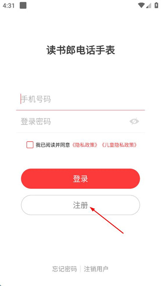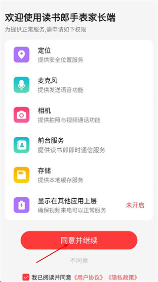 1、打開讀書郎手表家長(zhǎng)端APP,點(diǎn)擊同意并繼續(xù),進(jìn)入登錄注冊(cè)頁(yè)面。