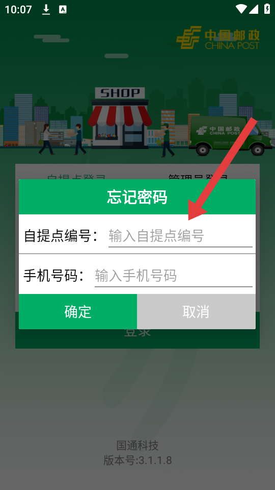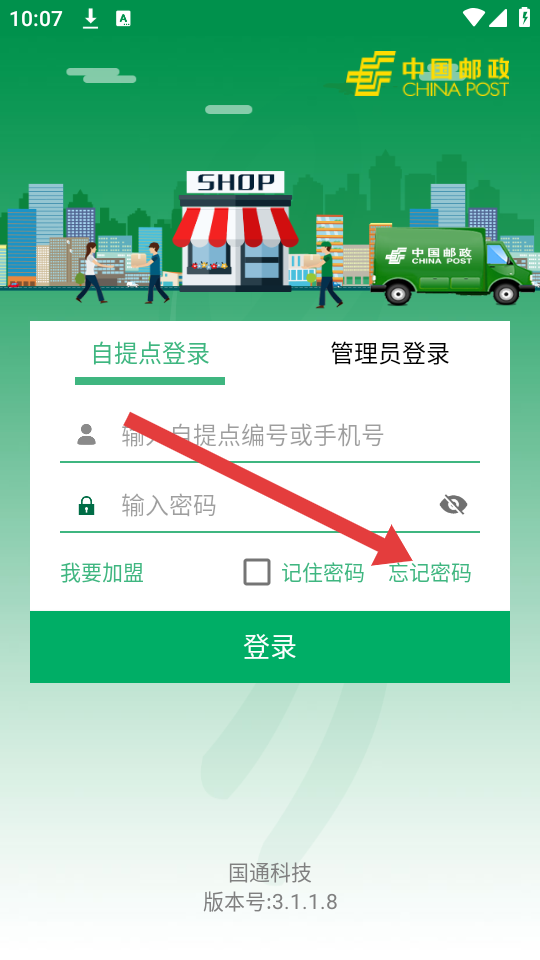 1、打開(kāi)中郵e通的app,進(jìn)入自提點(diǎn)的登錄頁(yè)面,這邊我們點(diǎn)擊忘記密碼,啟動(dòng)密碼找回流程。