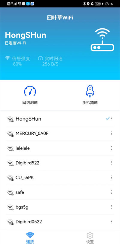 四葉草WiFiapp是一款非常好用的無線網(wǎng)管理軟件,功能非常的強大,能夠幫助用戶在手機運行速度比較慢的時候進行測速,及時的發(fā)現(xiàn)手機網(wǎng)絡(luò)上的各種問題,還支持用戶查看自己手機的網(wǎng)絡(luò)狀態(tài),獲取周圍的無線網(wǎng)信息,連接網(wǎng)速最快的無線網(wǎng)絡(luò),讓手機運行更加的順暢。