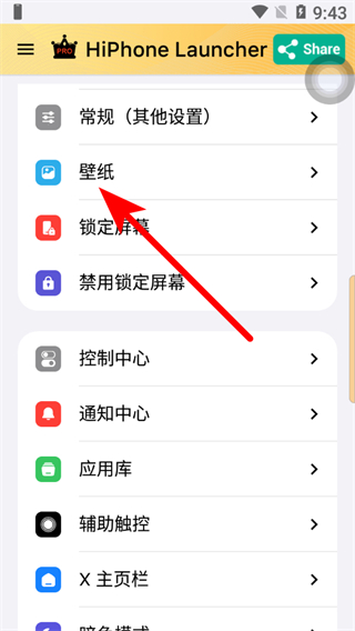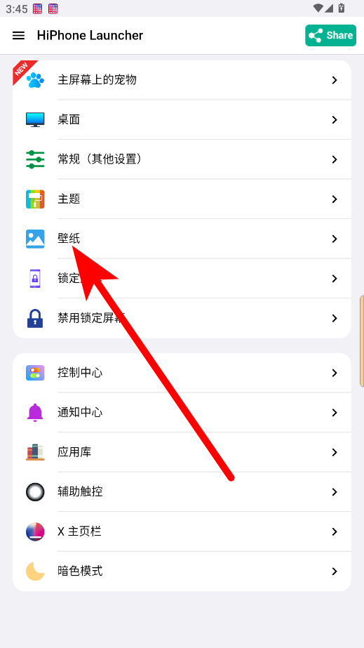 1、在HiPhone Launcher應(yīng)用設(shè)置界面,點擊壁紙選項,進入壁紙設(shè)置頁面。