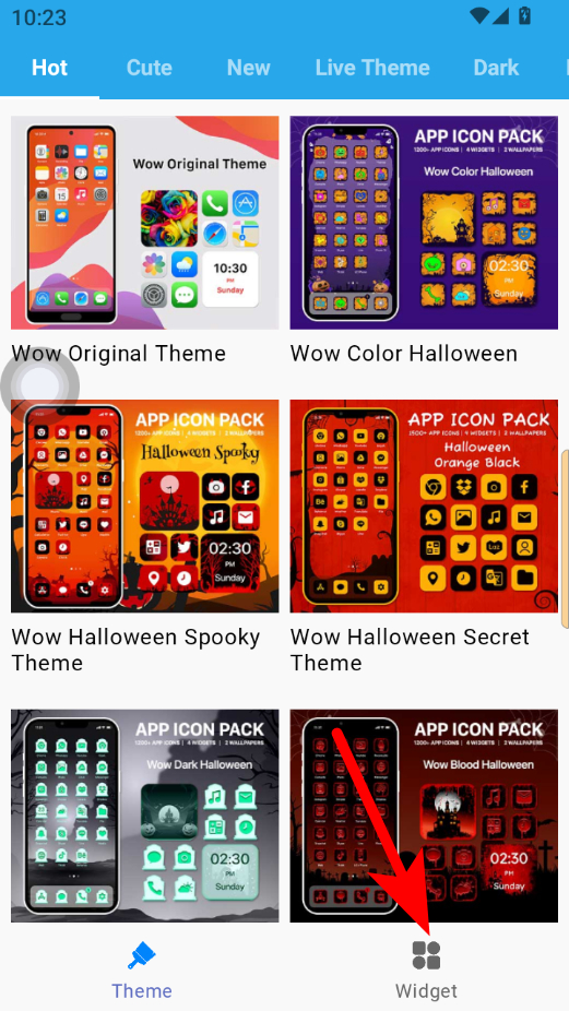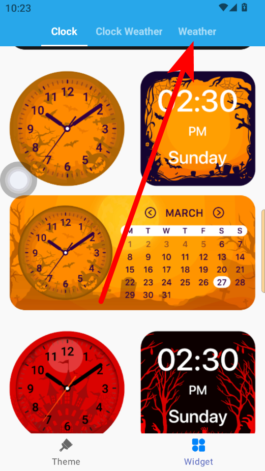 1、在主題和小組件頁面,點擊底部Widget選項,進入小組件選擇界面。