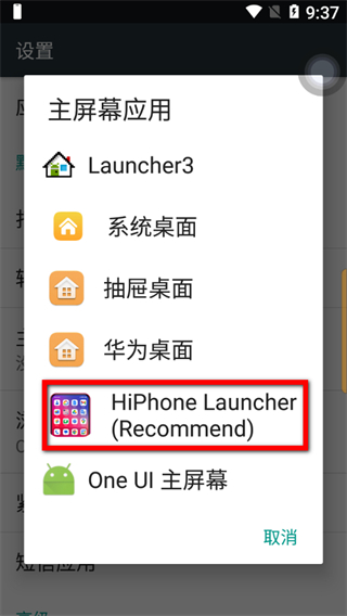 4、在應用列表中,點擊HiPhone Launcher(Recommend)選項,即可將其設置為默認啟動器。