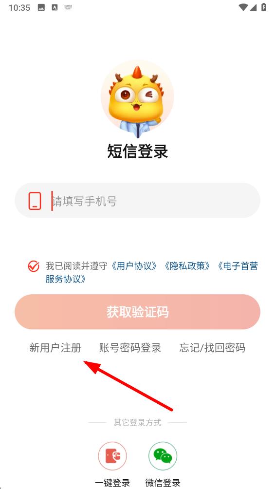 1、打開藥九九app,進入短信登錄界面點擊新用戶注冊選項。