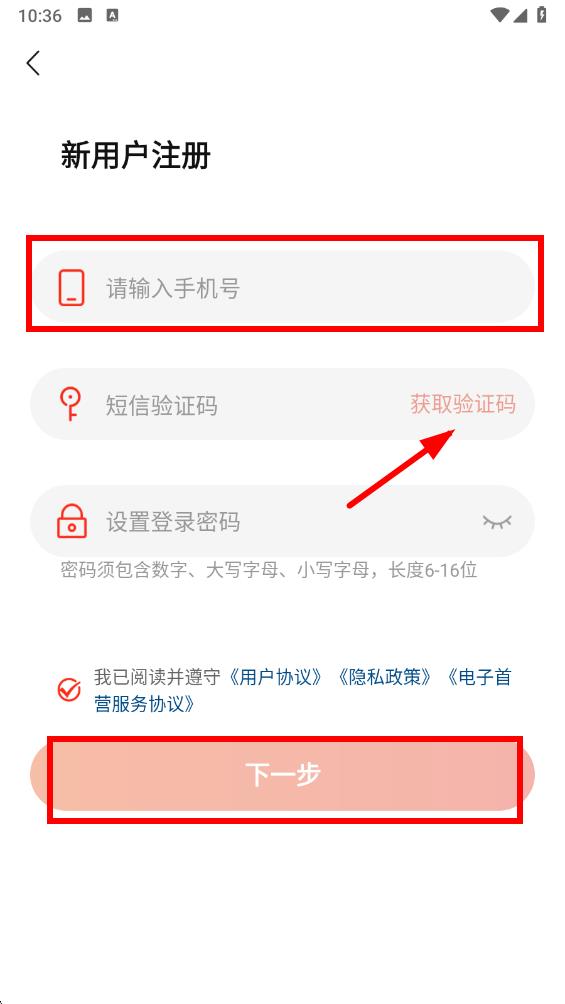 2、在新用戶注冊頁面輸入手機號獲取驗證碼后填入,按照要求設(shè)置登錄密碼點擊下一步。