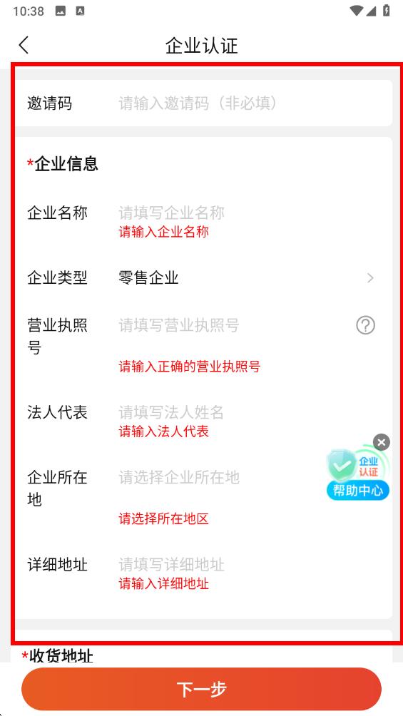 3、在企業(yè)認證頁面,可選擇填寫邀請碼,依次準確填寫企業(yè)名稱等信息,完成后點擊下一步,完成注冊流程。