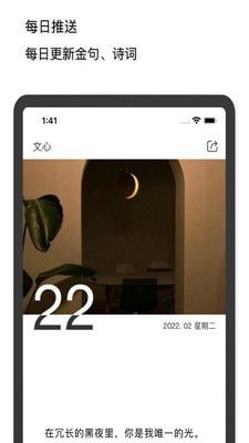 文心寫歌app支持大家隨時隨地在線閱讀欣賞精美的句子,支持大家在線閱讀并復制,快速的對優(yōu)美的句子進行提取,平臺還提供豐富的優(yōu)質(zhì)圖片任意大家復制。