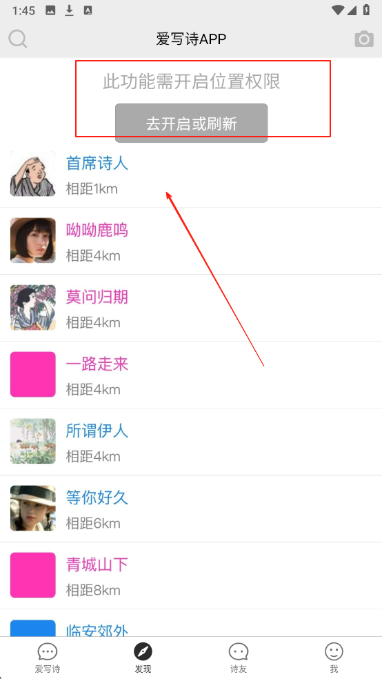 1、若要使用相關(guān)位置功能,點擊去開啟或刷新按鈕,按照提示開啟位置權(quán)限,之后可查看顯示的詩友列表,了解詩友與自己的相距距離。