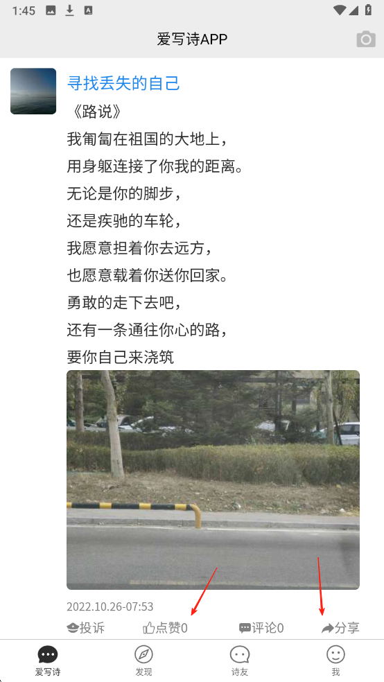 2、看到喜歡的詩歌作品,可點擊作品下方的點贊按鈕表達喜愛,也能點擊評論按鈕留下自己的看法,還能點擊分享按鈕將作品分享給他人。