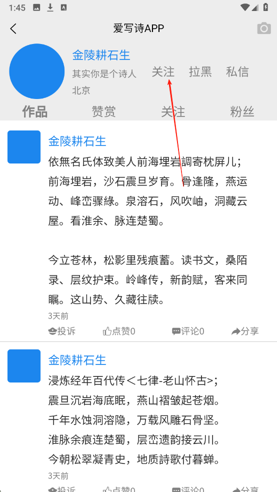 3、進入詩友個人主頁后,若想持續(xù)關(guān)注該詩友的作品,點擊關(guān)注按鈕,這樣就能及時獲取該詩友發(fā)布的新詩歌內(nèi)容。