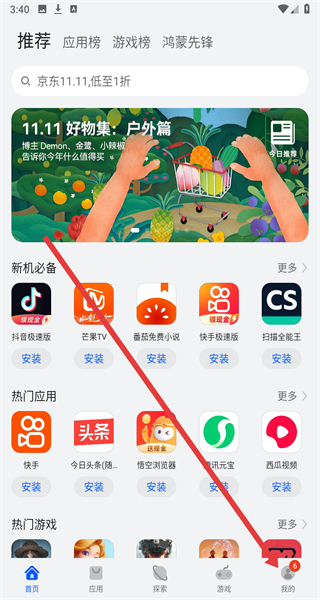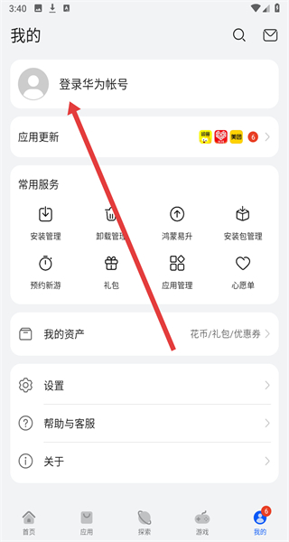 1、在華為應(yīng)用市場首頁點擊右下角“我的”,進入個人中心頁面。