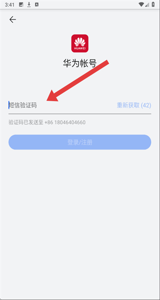 4、在短信驗證碼輸入頁面輸入收到的驗證碼,完成華為帳號登錄操作。