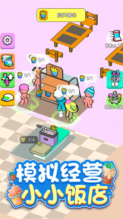 3、有趣的游戲模式,在這里玩家可以通過操控小人來搬運(yùn)食物、烹飪食材,給不同的顧客制作美食。